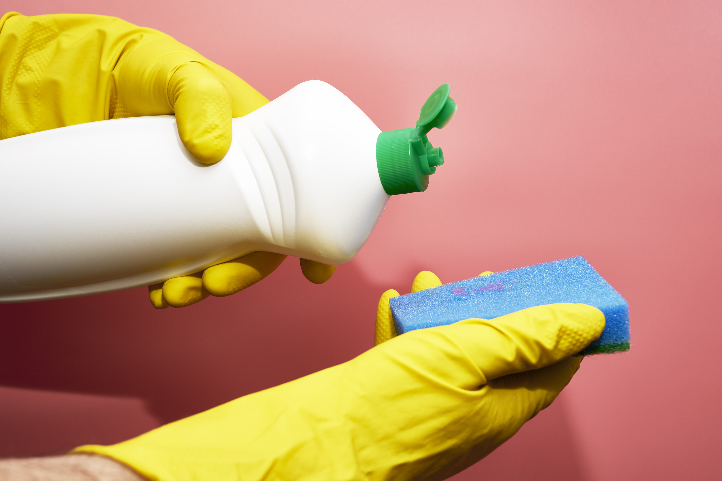 a man in rubber household gloves pours detergent from a bottle onto a sponge on a pink background. High quality photo