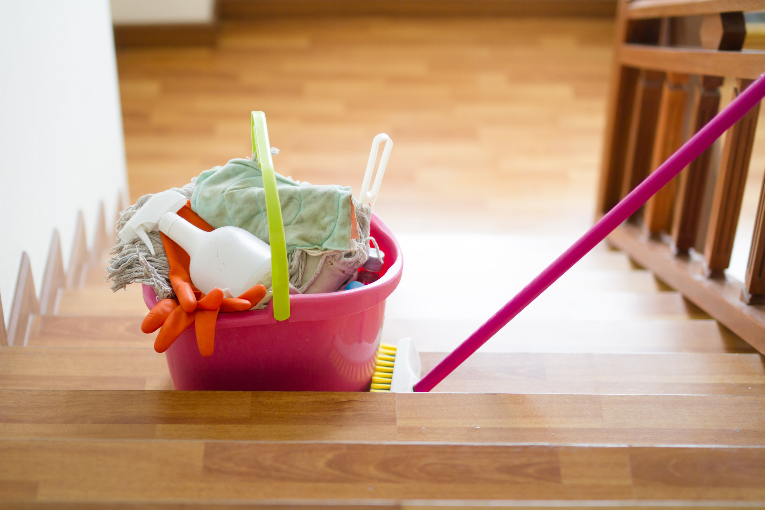 House cleaning tools prepare on stair. housekeeping and room service concept